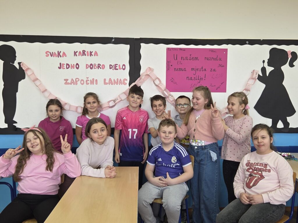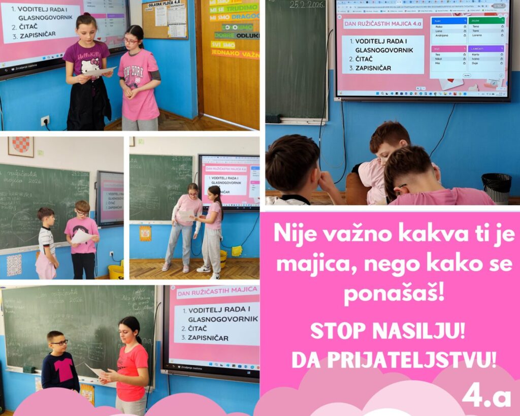 Dan ružičastih majica učenici 4.a obilježili su na satima Hrvatskoga jezika te Likovne i Glazbene kulture. Prvo su pročitali priču o nastanku Dana ružičastih majica te su radom u manjim skupinama istu naučili sažeto prepričati. Rad su nastavili pisanjem pitanja poput novinara, zamišljajući da izvješćuju s prvog Dana ružičastih majica. Osim pitanja napisali su i lijepe poticajne poruke.