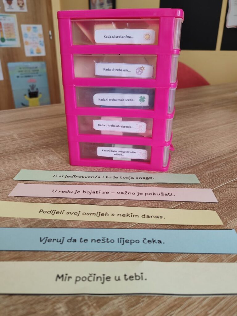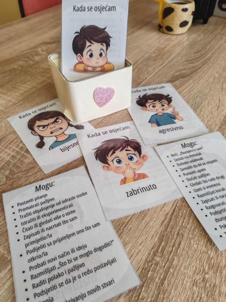Osim toga, izrađene su i kartice osjećaja „Što učiniti kada se osjećam…“. Na jednoj strani kartice nalazi se naziv određenog osjećaja, dok se na drugoj strani nalaze prijedlozi i savjeti kako se ponašati i kako si pomoći kada se tako osjećamo. Posebnu vrijednost ovim karticama su dali učenici razredne nastave koji su, tijekom radionica planiranih i provedenih u sklopu projekta, predlagali ideje i savjete koji su zatim uvršteni na kartice.