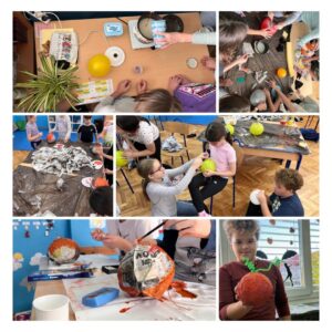 Učenici 4. a i 4. b razreda udružili su svoje vesele, vrijedne ručice i zajedno stvorili najtopliji jesenski ugođaj. Prvo su naučili kako se kašira. Od balona su oblikovali velike bundeve, pažljivo ih iskaširali i ostavili da se osuše do sljedećeg tjedna. Kada je napokon stigao trenutak za bojenje, hodnikom su zavladale nijanse narančaste, žute i crvene. Osim velikih bundeva, izradili su i male bundevice od stare tkanine i wc papira, koje sada krase školski hodnik. Jer kad se male ruke slože, sve se može!