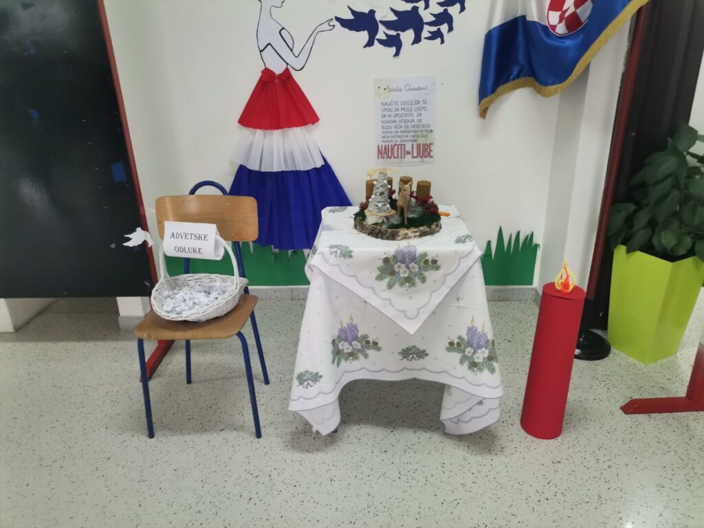 Započelo je došašće ili advent. Vrijeme je pripreme za Božić – dolazak Isusa Krista. U našoj školi, prigodno smo uredili hol i postavili adventski vijenac na kojem smo upalili prvu adventsku svijeću. Paljenje svijeća popraćeno je s molitvom i meditacijom, te su učenici sa vjeroučiteljicom Dijanom Vujević otpjevali adventsku pjesmu Visom leteč.
