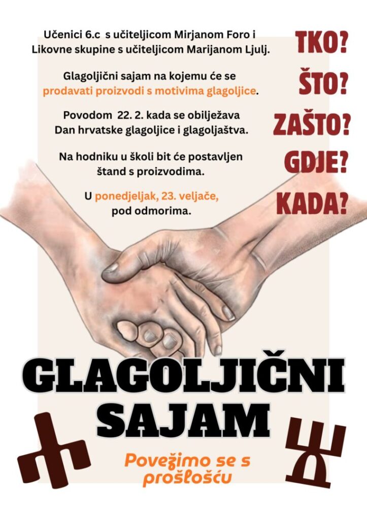 Učenici 6.c razreda s učiteljicom Hrvatskog jezika Mirjanom Foro organizirali su Glagoljični sajam s temom “Povežimo se s prošlošću”, a u tome su im se pridružili i učenici Likovne skupine koje vodi učiteljica Marijana Ljulj. Zajedničkom suradnjom učenici su izrađivali različite proizvode s motivima glagoljice povodom 22. veljače kada se obilježava Dan hrvatske glagoljice i glagoljaštva.