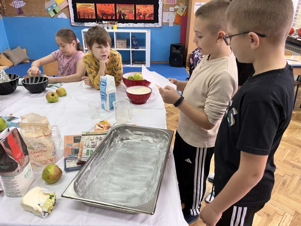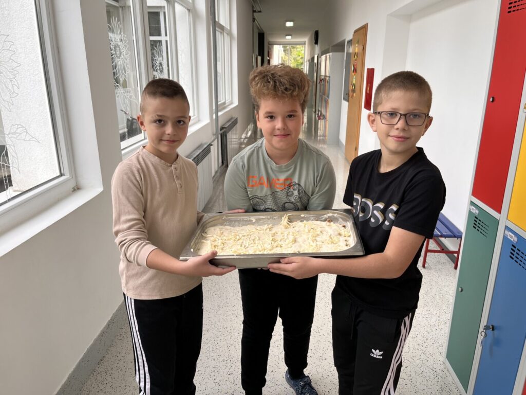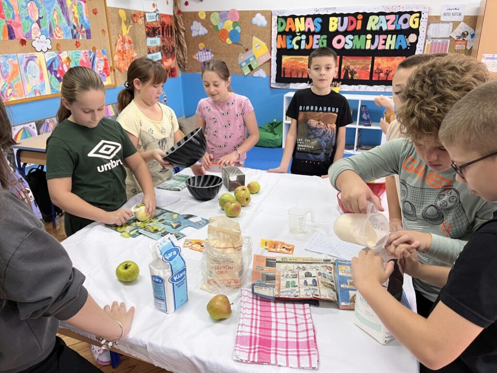Učenici 4. b razreda danas su na poseban i veseo način obilježili Svjetski dan jabuka. Jutro su započeli razigrano, pokretom i igrama koje su slavil – jabuku. Podijeljeni u skupine dječaka i djevojčica, učenici su se upustili u slatko nadmetanje – svaka je skupina pripremila svoj kolač od jabuka. Kolači su zatim odneseni u školsku kuhinju, gdje su ih naši kuhari s ljubavlju ispekli. Miris pečenih jabuka ispunio je školu, a učenici su kolače ponosno podijelili kuharima, kušali ih zajedno s učiteljicom i počastili nekoliko učitelja. Dan je bio ispunjen osmijesima, druženjem i slatkim okusima jeseni.