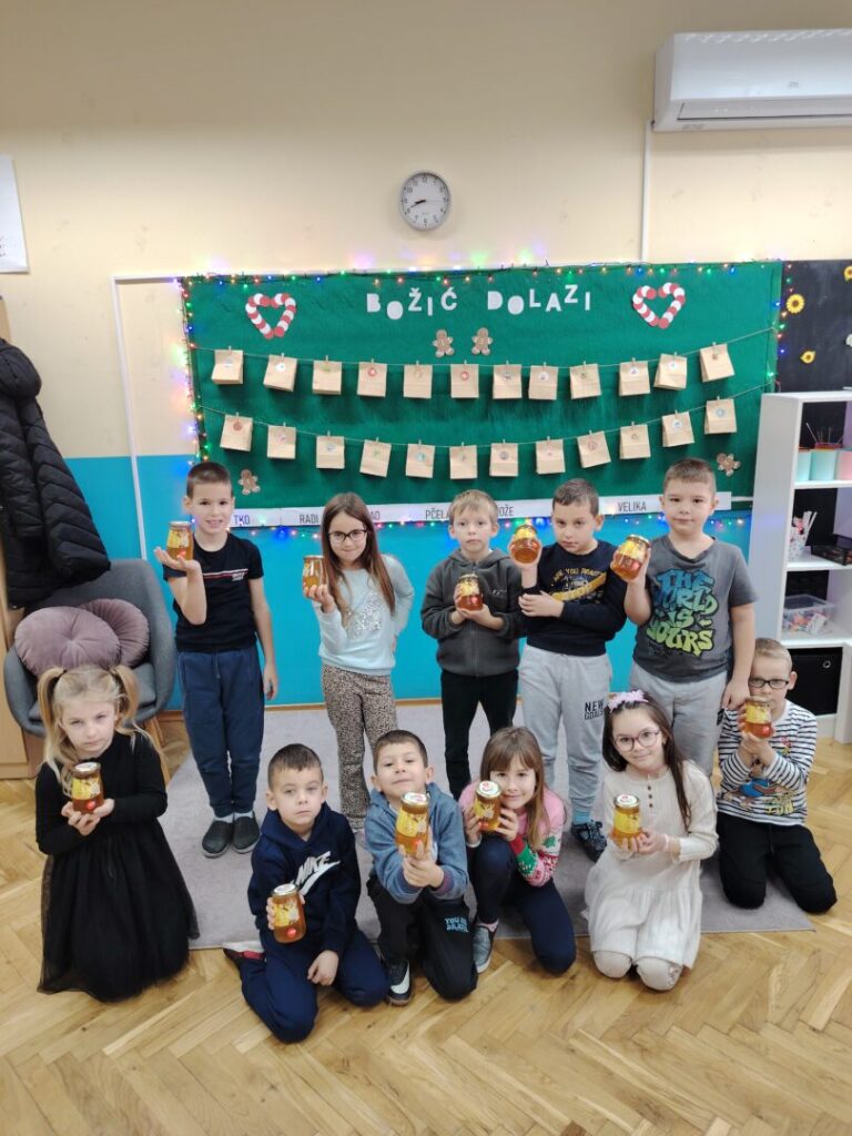 Naši su prvašići s velikim zanimanjem poslušali kratko predavanje o tome kako nastaje med, zašto su pčele važne za prirodu i na koji način možemo brinuti o njima. Naučili su da pčele nisu samo proizvođači meda, već i oprašivači koji pomažu rastu brojnih biljaka.