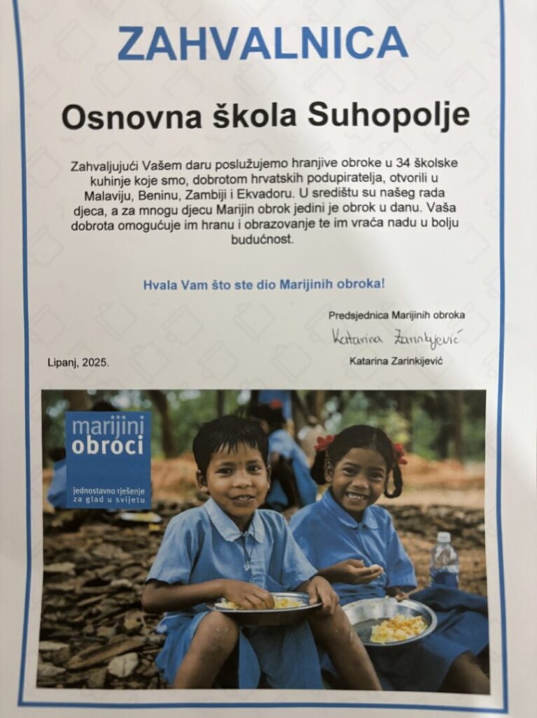 S radošću dijelimo vijest da smo u protekloj školskoj godini, humanitarnim prilozima naših učenika i njihovih roditelja, te djelatnika škole, prikupili novčana sredstava kojima smo kao dio Marijinih obroka, osigurali hranjive obroke u školama u kojima djeluju, za dvadeset i pet učenika tijekom cijele godine. Našim velikim srcem pružamo nadu i činimo svijet bolji.
